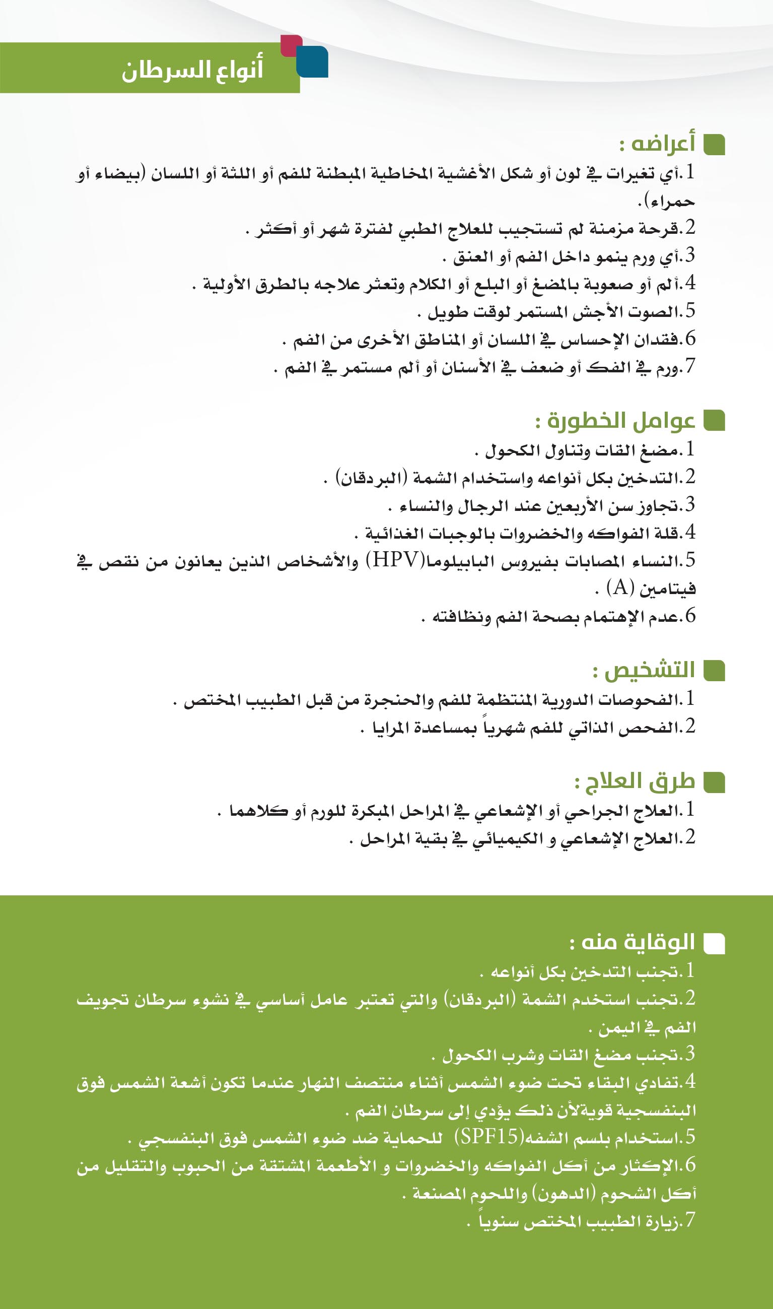 The association organizes educational awareness weeks on oral cancer and the risks of smoking and toombak. تقوم الجمعية بتنظيم الأسابيع التثقيفية عن مرض سرطان الفم ومخاطر التدخين والتمباك.